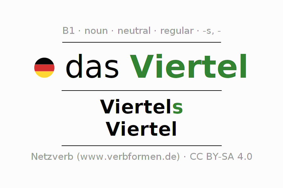 - Plural: die Viertel, der Viertel, den Vierteln, die Viertel