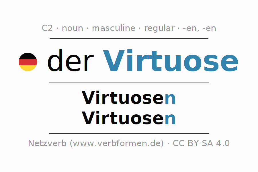- Singular: der Virtuose, des Virtuosen, dem Virtuosen, den Virtuosen