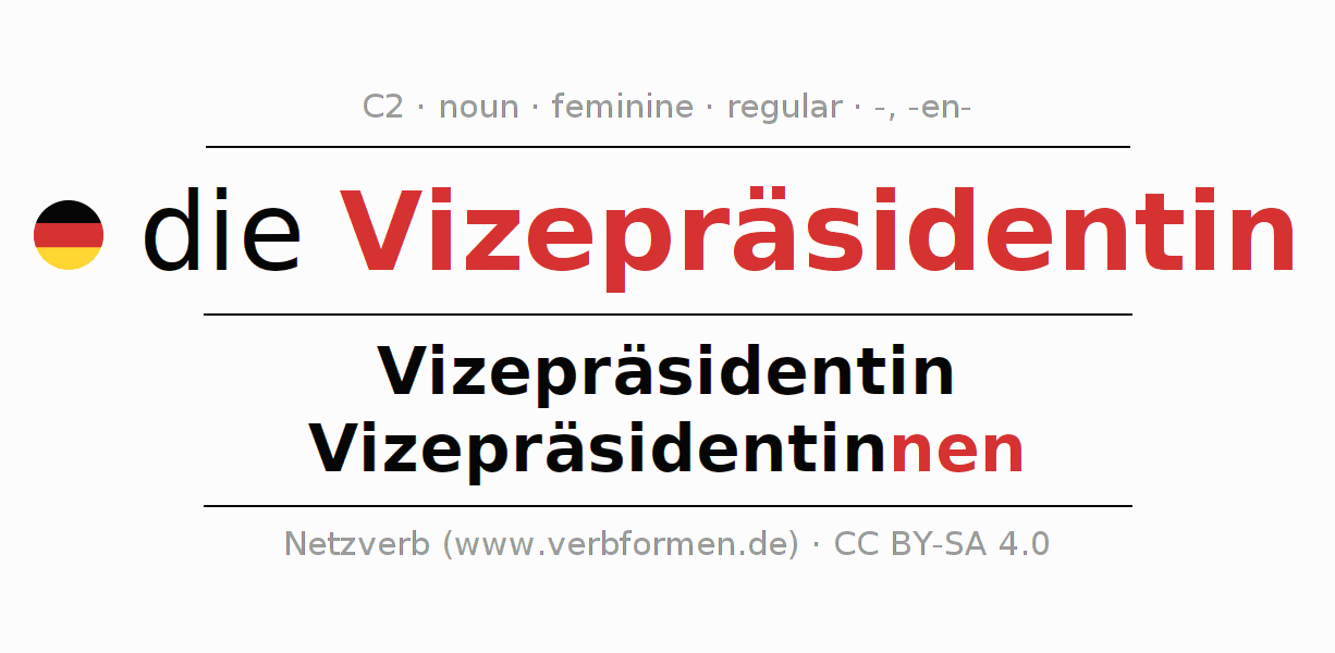 - Singular: die Vizepräsidentin, der Vizepräsidentin, der Vizepräsidentin, die Vizepräsidentin