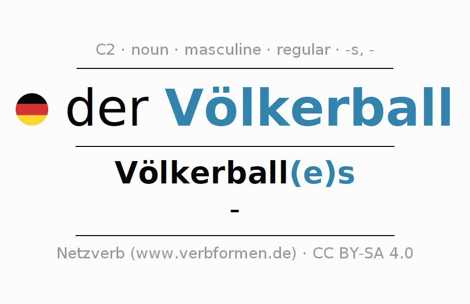 - Singular: der Völkerball, des Völkerball(e)s, dem Völkerball(e), den Völkerball
