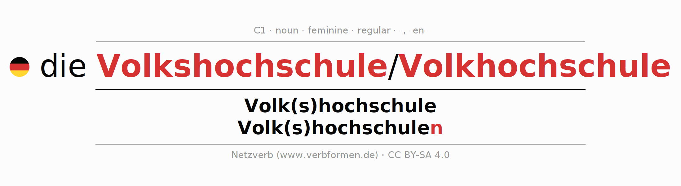 | Nom. | die Volk(s)hochschule | die Volk(s)hochschulen |