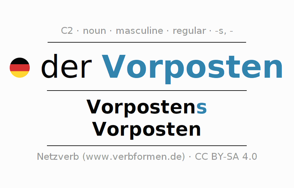 - Singular: der Vorposten, des Vorpostens, dem Vorposten, den Vorposten