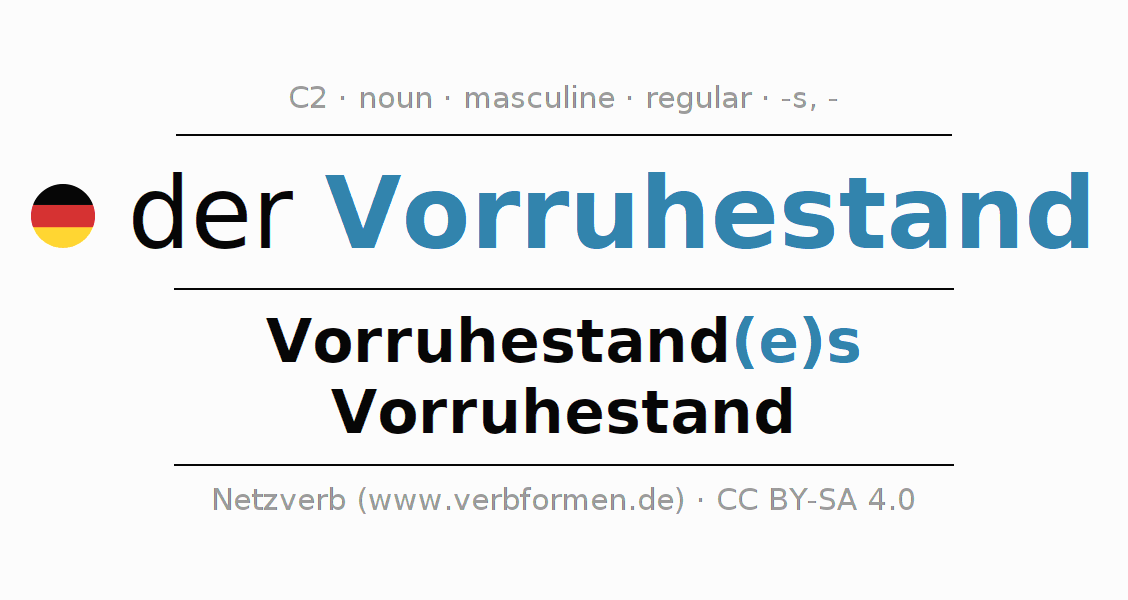 The declension of Vorruhestand as a table with all forms in singular (singular) and plural (plural) and in all four cases nominative (1st case), genitive (2nd case), dative (3rd case) and accusative (4th case). Especially for German learners the correct declension of the word Vorruhestand is crucial.