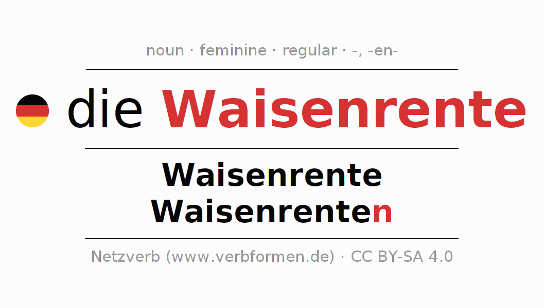 - Singular: die Waisenrente, der Waisenrente, der Waisenrente, die Waisenrente