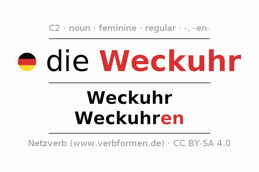 The declension of Weckuhr as a table with all forms in singular (singular) and plural (plural) and in all four cases nominative (1st case), genitive (2nd case), dative (3rd case) and accusative (4th case). Especially for German learners the correct declension of the word Weckuhr is crucial.