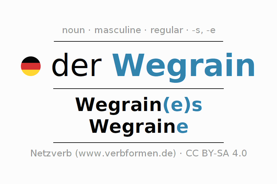 The declension of Wegrain as a table with all forms in singular (singular) and plural (plural) and in all four cases nominative (1st case), genitive (2nd case), dative (3rd case) and accusative (4th case). Especially for German learners the correct declension of the word Wegrain is crucial.