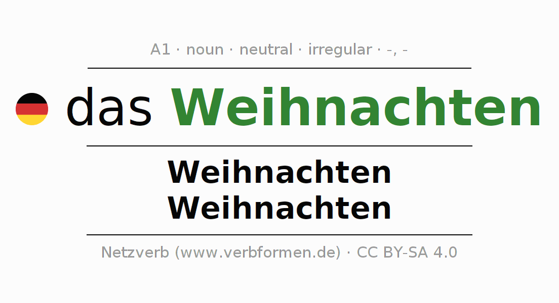 The declension of Weihnachten as a table with all forms in singular (singular) and plural (plural) and in all four cases nominative (1st case), genitive (2nd case), dative (3rd case) and accusative (4th case). Especially for German learners the correct declension of the word Weihnachten is crucial.