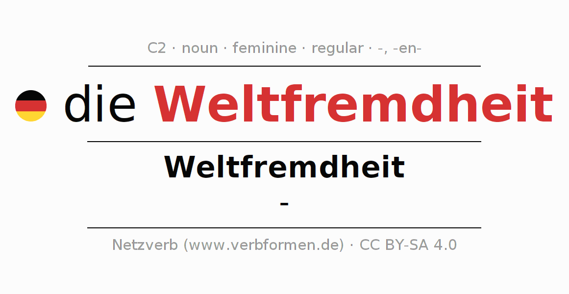 The declension of Weltfremdheit as a table with all forms in singular (singular) and plural (plural) and in all four cases nominative (1st case), genitive (2nd case), dative (3rd case) and accusative (4th case). Especially for German learners the correct declension of the word Weltfremdheit is crucial.