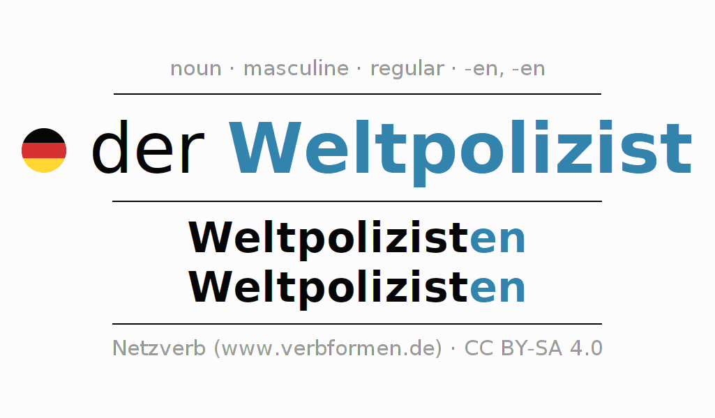 - Singular: der Weltpolizist, des Weltpolizisten, dem Weltpolizisten, den Weltpolizisten
