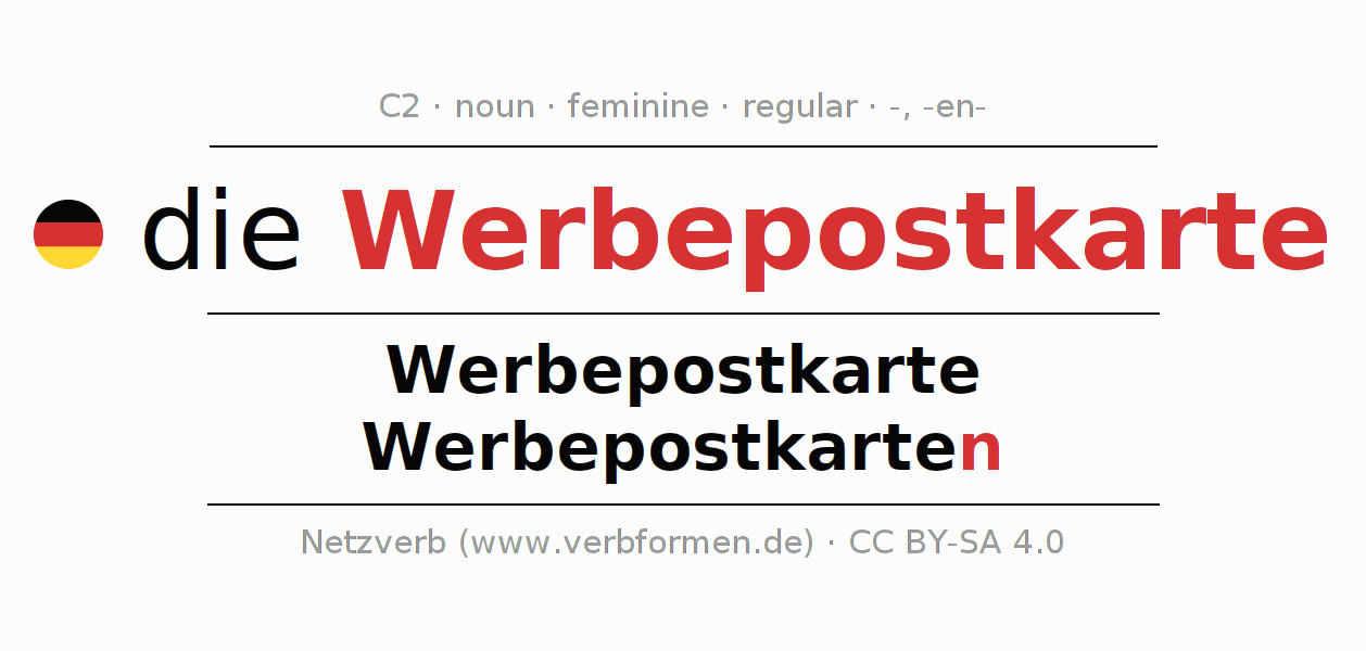 - Plural: die Werbepostkarten, der Werbepostkarten, den Werbepostkarten, die Werbepostkarten