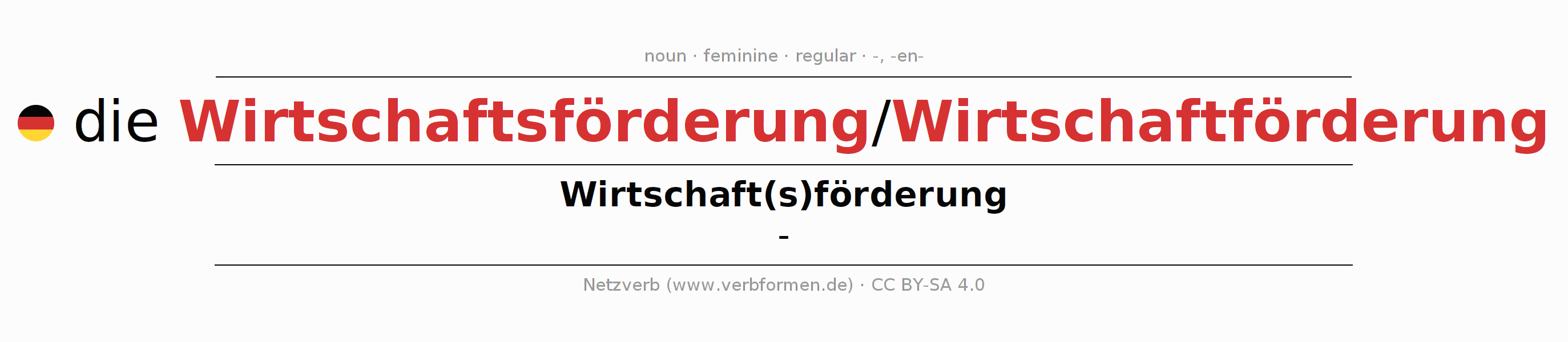 - Singular: die Wirtschaft(s)förderung, der Wirtschaft(s)förderung, der Wirtschaft(s)förderung, die Wirtschaft(s)förderung