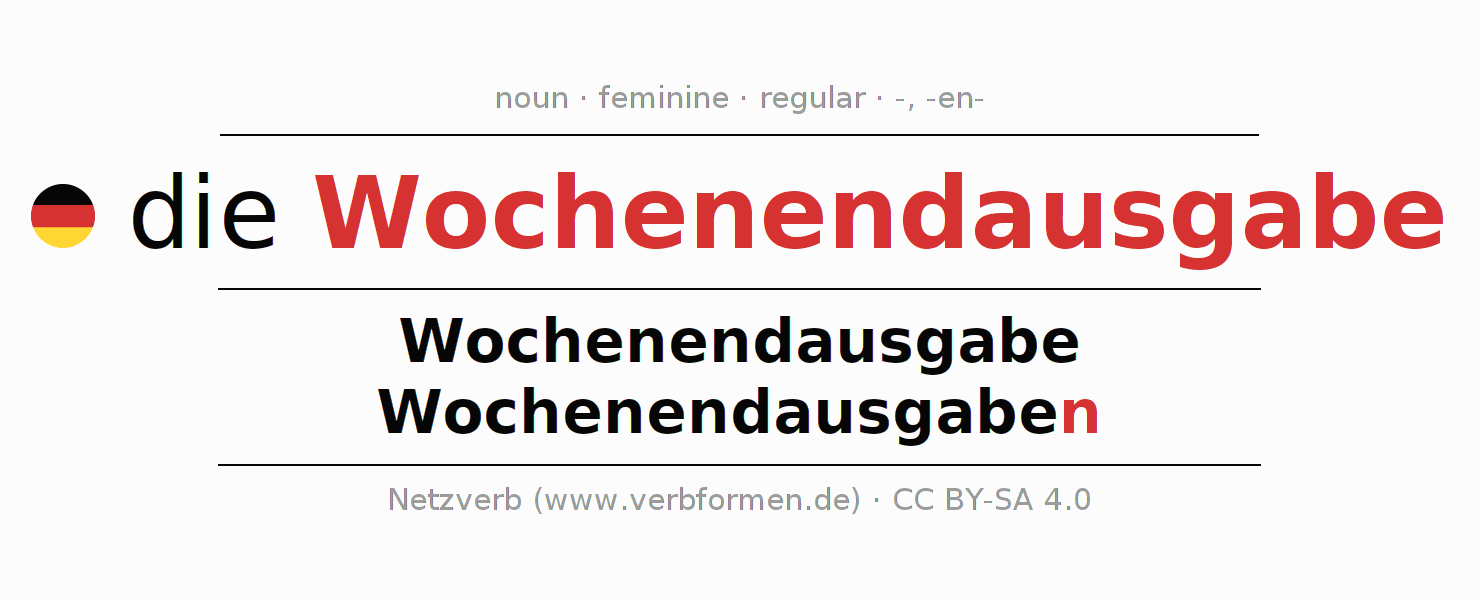 - Singular: die Wochenendausgabe, der Wochenendausgabe, der Wochenendausgabe, die Wochenendausgabe