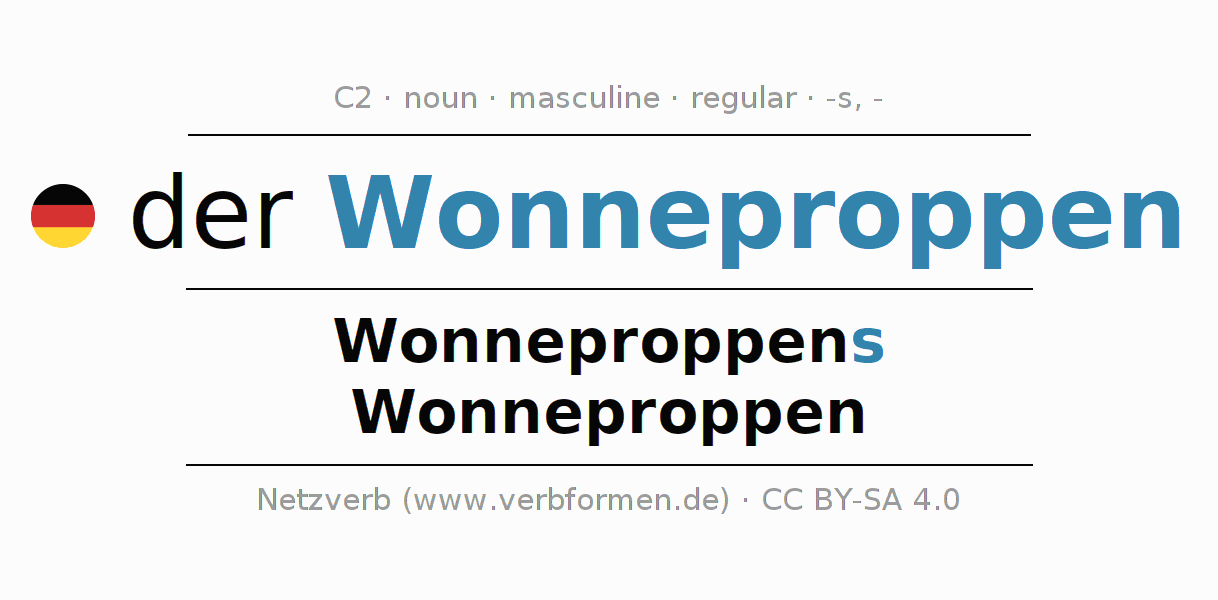 The declension of Wonneproppen as a table with all forms in singular (singular) and plural (plural) and in all four cases nominative (1st case), genitive (2nd case), dative (3rd case) and accusative (4th case). Especially for German learners the correct declension of the word Wonneproppen is crucial.