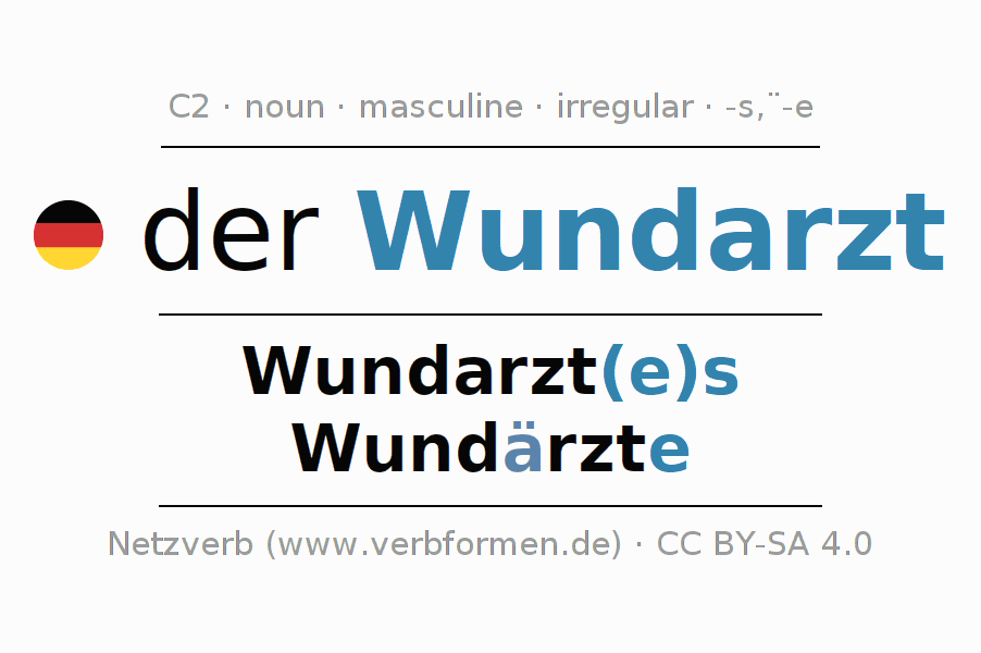 - Plural: die Wundärzte, der Wundärzte, den Wundärzten, die Wundärzte
