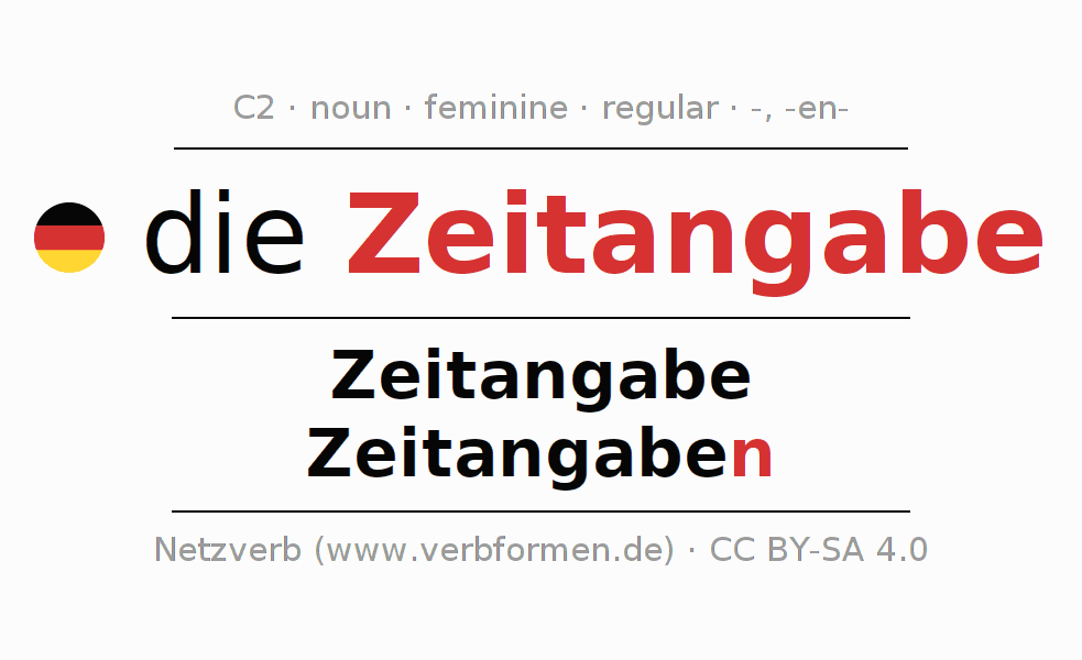 - Singular: die Zeitangabe, der Zeitangabe, der Zeitangabe, die Zeitangabe