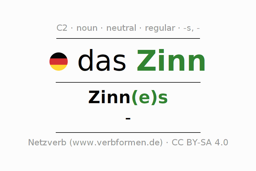 - Singular: das Zinn, des Zinn(e)s, dem Zinn(e), das Zinn