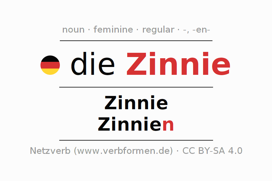 - Plural: die Zinnien, der Zinnien, den Zinnien, die Zinnien