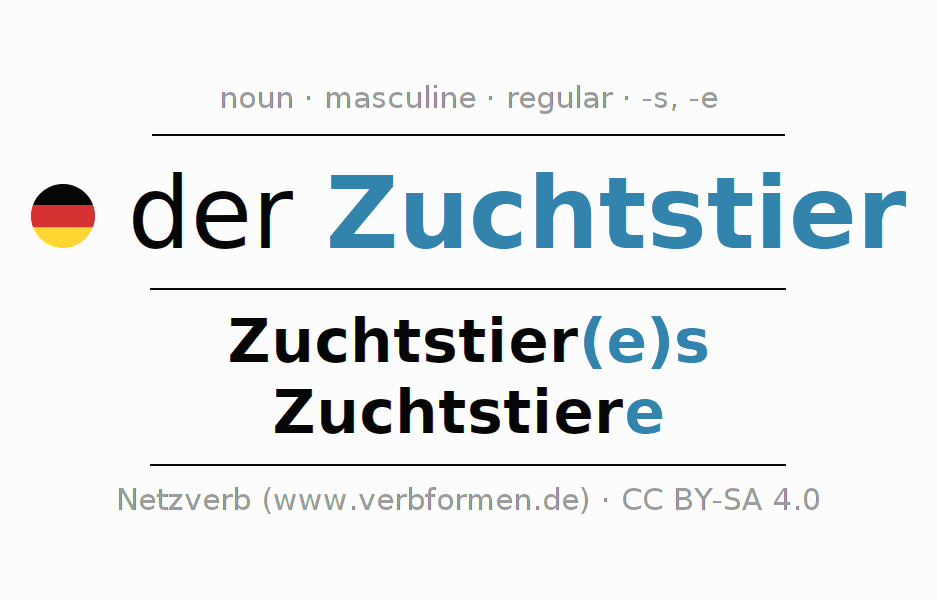 - Singular: der Zuchtstier, des Zuchtstier(e)s, dem Zuchtstier(e), den Zuchtstier