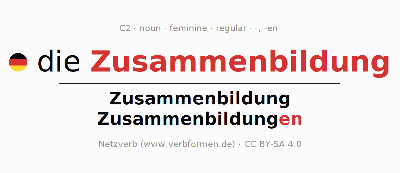 - Singular: die Zusammenbildung, der Zusammenbildung, der Zusammenbildung, die Zusammenbildung